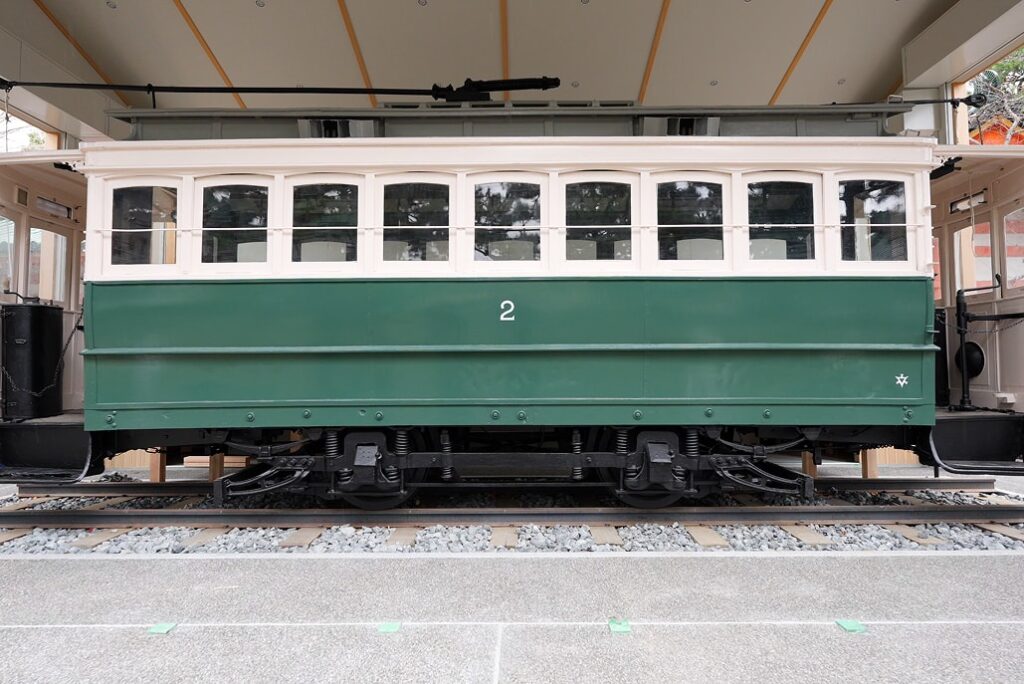 明治44年(1911)製の本車両は、のちに京都市に移管され「京都市交通局2号電車」として運行。