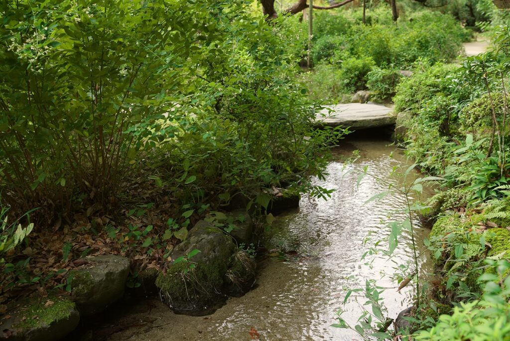 昭和44年(1969)、孝明天皇百年祭の記念事業として、平安時代の特色である野筋(道筋)と遣水が設けられました。